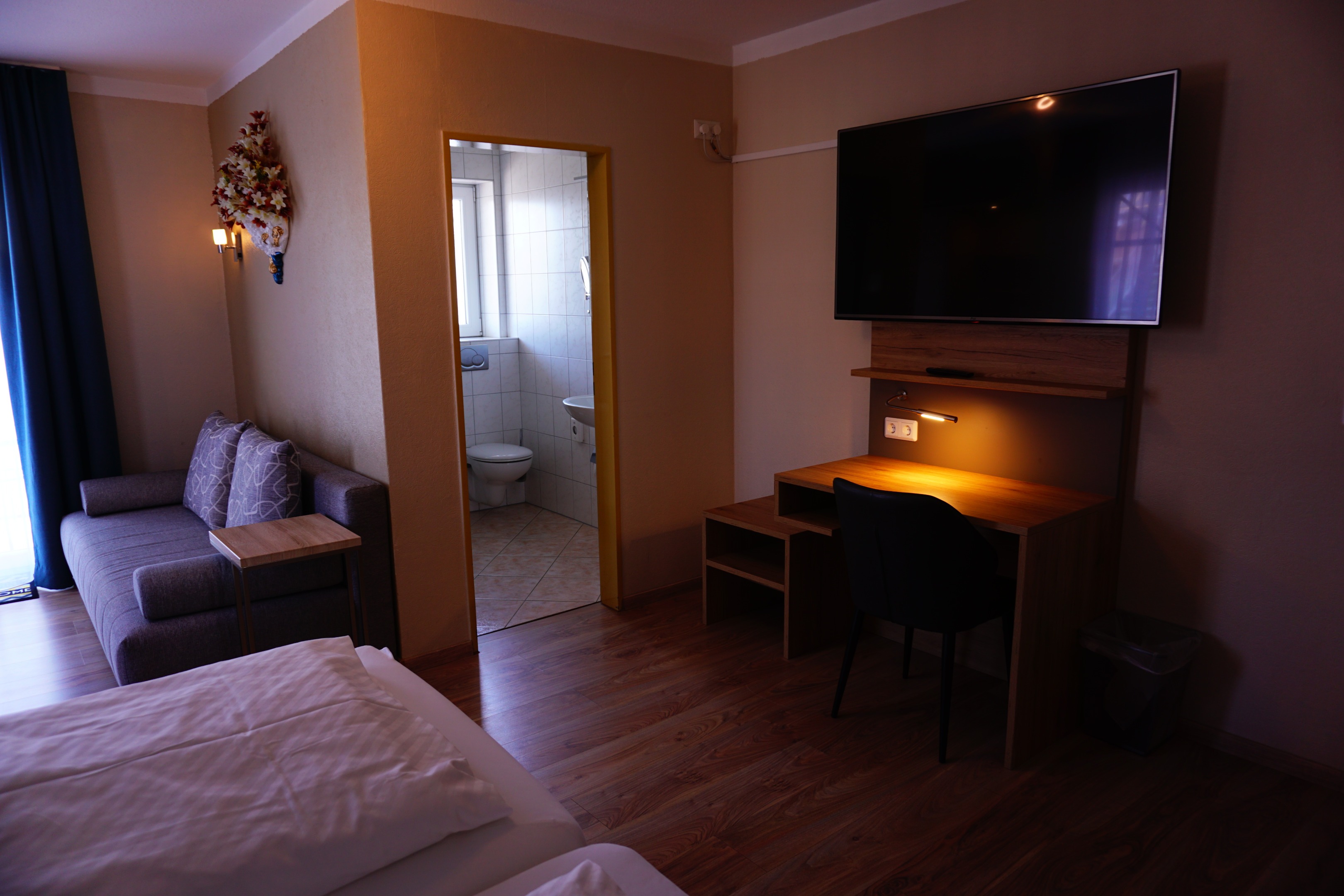 Unsere komfortablen Zimmer und bieten Ihnen ein gemütliches Doppelbett mit Nachttisch und Nachtlampe für eine erholsame Nacht. Im Badezimmer stehen Ihnen Badetücher, Handtücher und eine Fußmatte zur Verfügung. Für Unterhaltung sorgt ein Flachbildfernseher, während Sie mit unserem kostenfreien WLAN jederzeit online bleiben. Wertsachen können Sie sicher in Ihrem Tresor/Safe aufbewahren. Zudem steht ein Wasserkocher für Ihre heißen Getränke bereit.